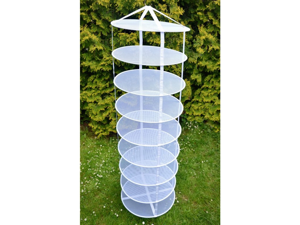 Rozkladacia kruhová sieť na sušenie húb alebo byliniek. 8 poschodí s priemerom 56,5cm poskytuje celkovú plochu viac ako 2m2. Dĺžka (výška) siete v rozloženom stave je 165cm. Sieť je z bokov otvorená, preto je vhodná najmä na použitie v miestnostiach. Je možné ju zavesiť kdekoľvek v miestnosti, v prípade bezvetria aj vonku, napríklad do záhrady alebo na balkón. Najväčšou výhodou siete je veľká úspora priestoru a jednoduchá manipulácia. Už viac nemusíte mať huby alebo bylinky rozloženené po celej miestnosti. Sieť aj s hubami môžete kedykoľvek jednoducho premiestniť na vhodné miesto. V porovnaní s elektrickými sušičkami ušetríte na elekrickej energii a po zložení sie veľmi ľahko uskladníte (výška zloženej siete je iba 2cm). Sieť dodávame v praktickom obale na zips.